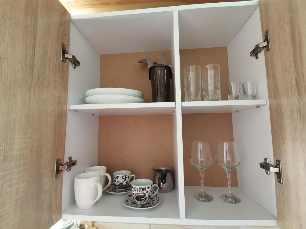 Kitchenette, Refrigerator, Electric kettle, Kitchenware, Stovetop, Dining table, Wine glasses