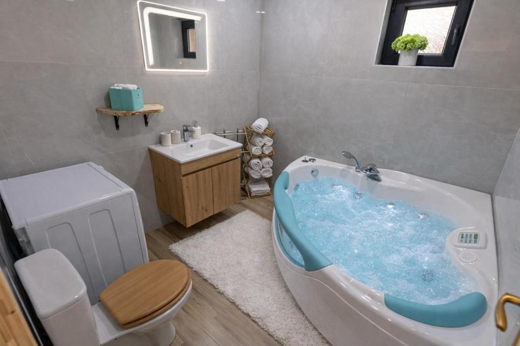 This luxurious holiday home offers a pool with a view, a hot tub and a sauna. Featuring a private entrance, this spacious holiday home also comprises 2 bedrooms, a seating area and 1 bathroom with a bath and a shower. Guests will find a stovetop, a refrigerator, kitchenware and a microwave in the kitchen. The holiday home also provides guests with a barbecue. The air-conditioned holiday home provides a flat-screen TV with streaming services, a washing machine, soundproof walls, a tea and coffee maker as well as an inner courtyard view. The unit offers 3 beds.